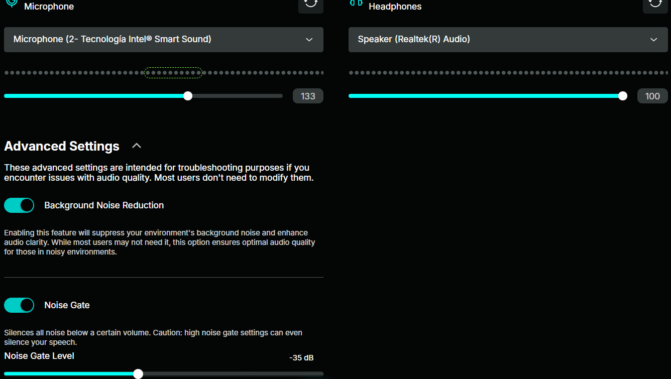 Then, go to Advanced Settings on the bottom and check if the "Background Noise Reduction" or "Noise Gate" are enabled.