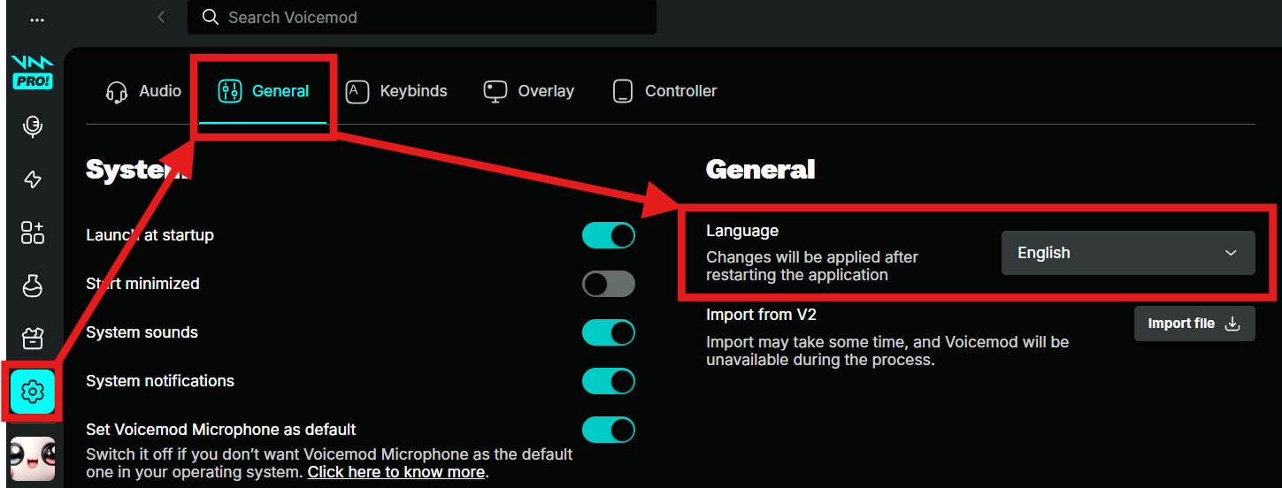 To change your preferred language in Voicemod go to left side bar and select Settings.