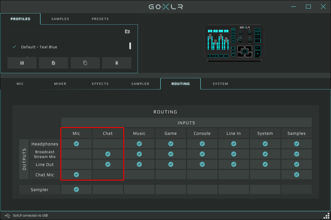 - Finally, set the 'Chat' input channel (the special Voicemod device channel we setup above in Voicemod settings) to route to your 'Line Out'/'Broadcast Stream Mix' output channels. (This way Voicemod effects will be heard via the system, like in games, etc). !Note you cannot hear these effects in your headphones as noted above.