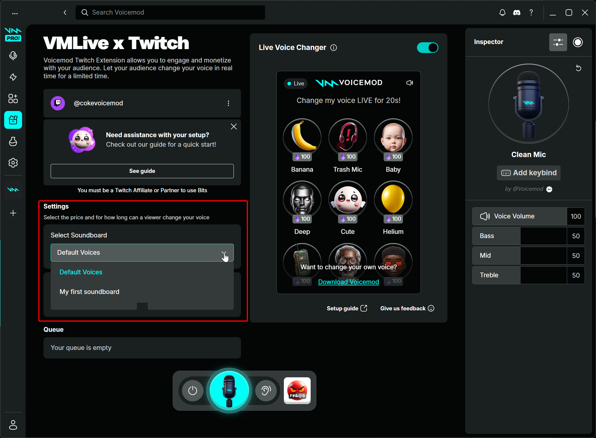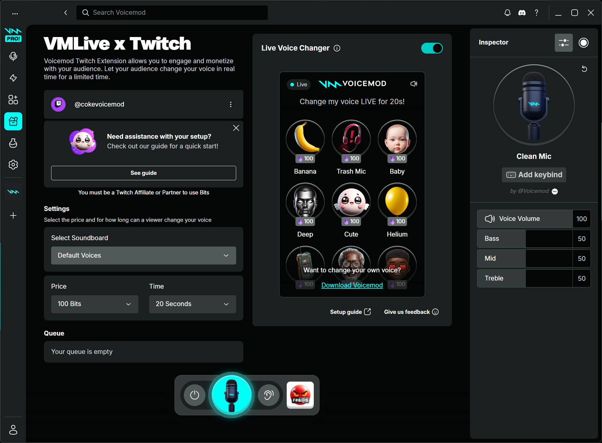 Customize the voices you want to use, how long they will remain active and more. Give your viewers the ability to turn you into a squeaky Chipmunk, a Musical Star, a Creepy Clown, a Robot, and many others, and let the clip-worthy moments roll in! Voicemod Live.