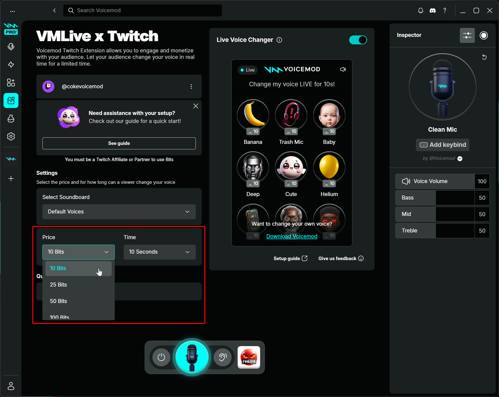 - Once setup is finalized and the extension is configured and running smoothly, you can set how many Bits each voice will cost for viewers to activate, as well as how long they will be applied.