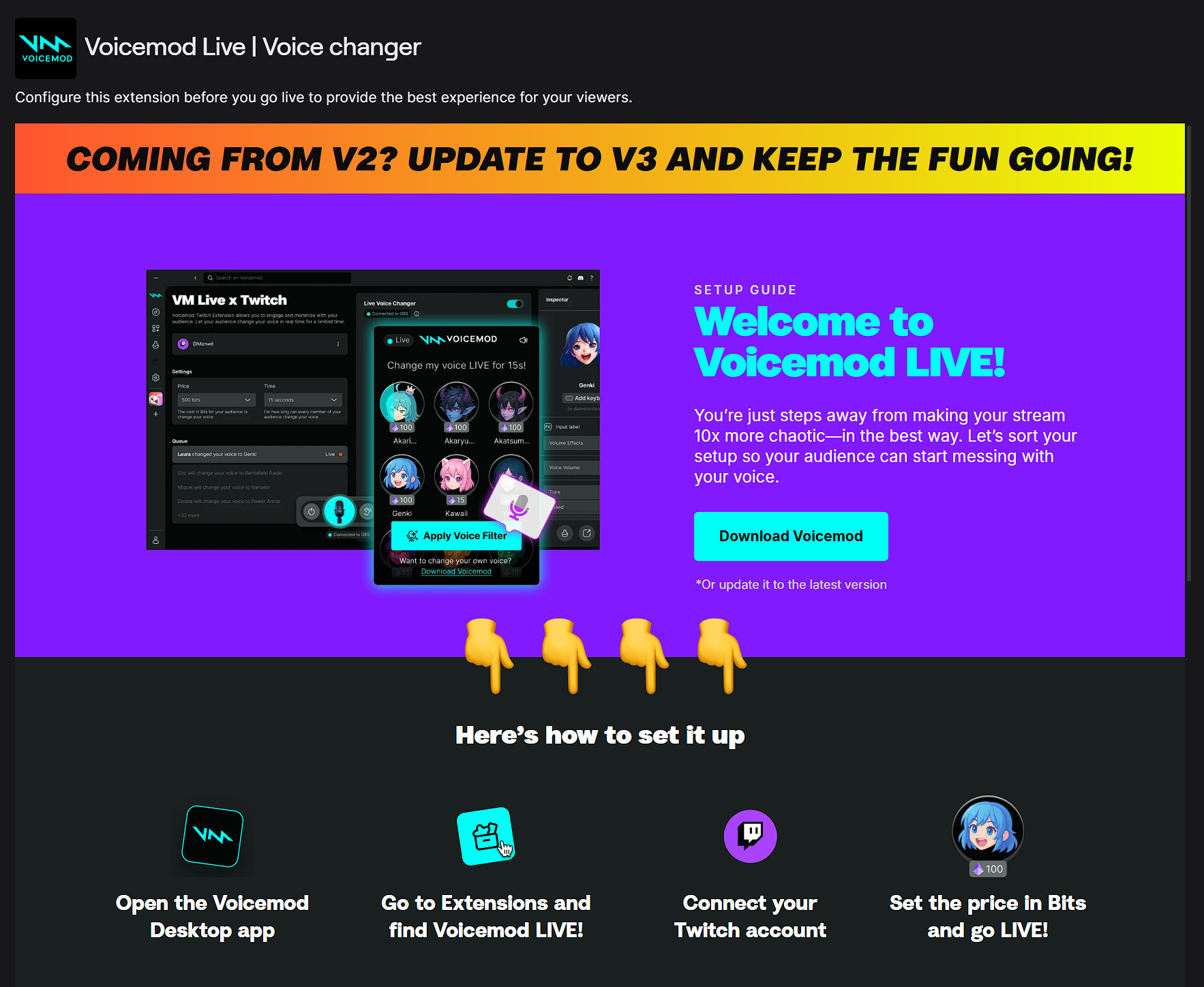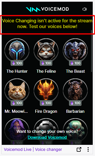 Requirements: Streamers must have the Voicemod v3 application installed, running, and configured correctly in OBS to use this extension during live streams.
