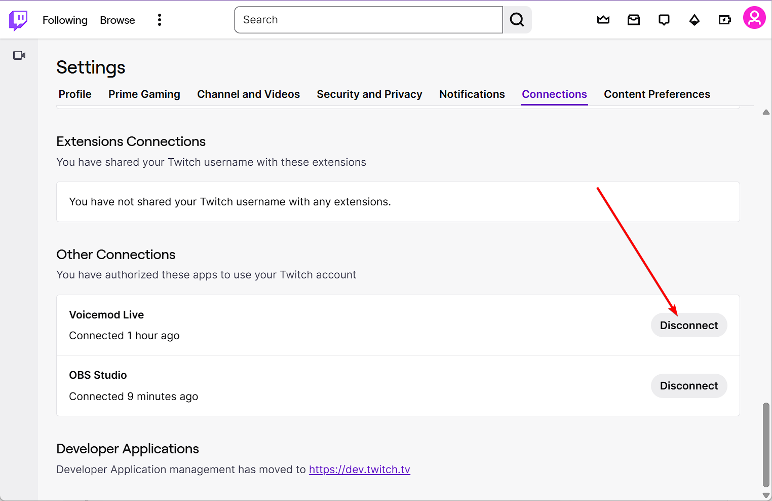 If you want to disconnect your Twitch account from the Voicemod Live extension you can go directly to your Twitch account settings, Connections tab, Other Connections section and click on "Disconnect" the Voicemod Live extension.