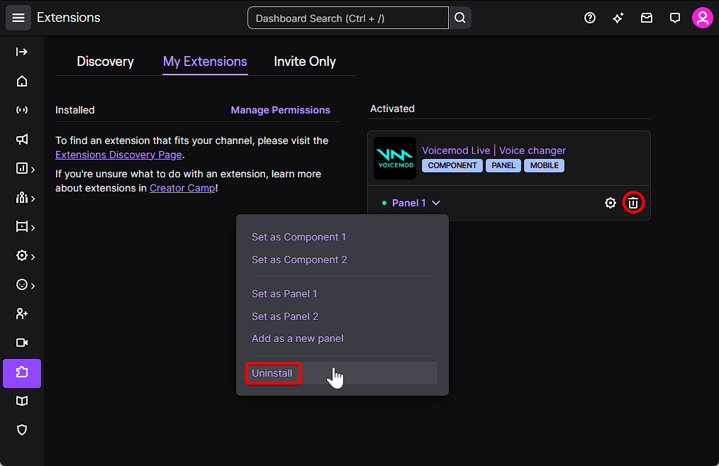 Once you confirm the disconnection of your account, Voicemod Live will no longer work, but it will still appear among your panels if you do not disable the corresponding panel or uninstall the extension.